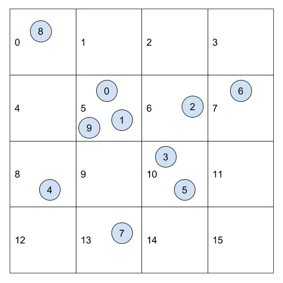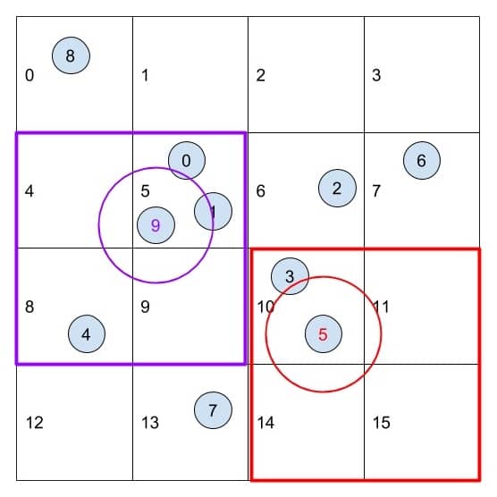 The images show a simplified version in 2D plane, with grid cell width equals to 2 times the maximum search radius. Each boids would only need to check at most 4 neighbor cells (or in 3D case, 8 neighbor cells). This significantly reduces the number of global memory access.