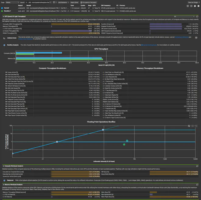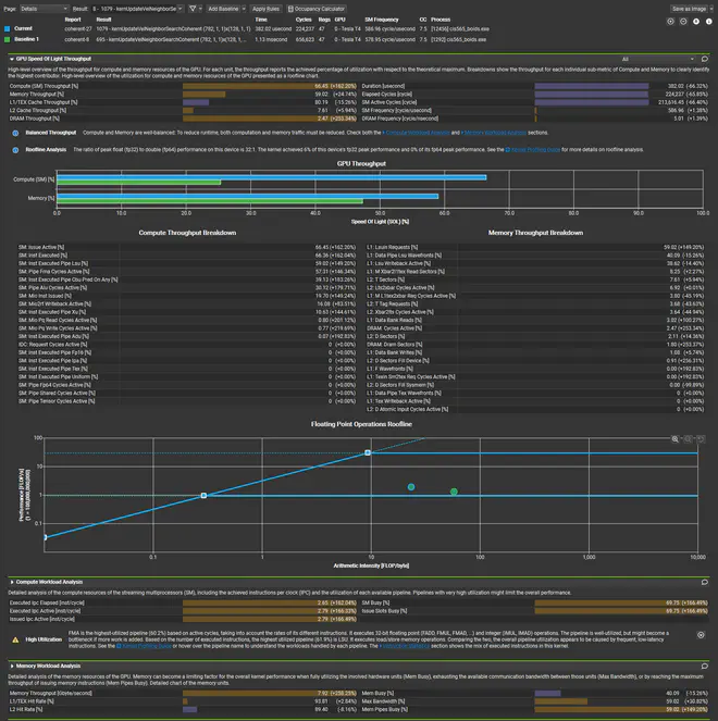 The coherent grid search is faster than the scattered grid search, especially when the number of boids is huge. I didn’t expect to see such big leap. I think this is because the coherent grid search has better memory access pattern, and the overhead of sorting is less than the overhead of global memory access.
