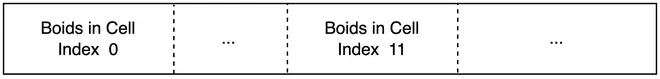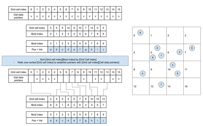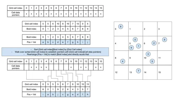 We can store the sorted position and velocity of boids based on cell indexes, so that boids data are contiguous in memory from the perspective of grid cells. The specific implementation eliminates an overhead associated with fetching a pointer index from global memory to access the position and velocity of boids in global memory. Interestingly, one parallelizing sort is considerably faster than the cost of random fetches of global memory. Also, coalesced memory access benefits more from cache and compiler optimizations.