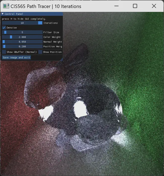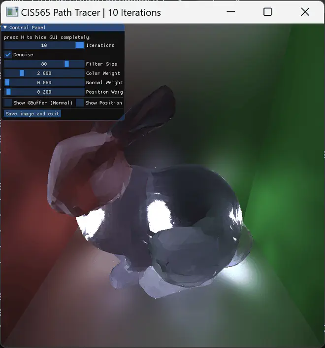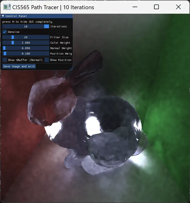Across different scenes, cornell and bunny are two of the most representative scenes. The cornell scene is simple and mostly diffusive materials. Our denoising filter performed very well in this case. On the other hand, the bunny scene is more complex, with more specular and refractive materials. We can clearly see that the filter is starting to blur some details of the bunny and the reflection and refraction is not nearly as clear as the reference image. However, the filter performed consistently in different lighting conditions, in most cases there are only minor artifacts/over-exposure.