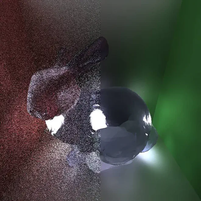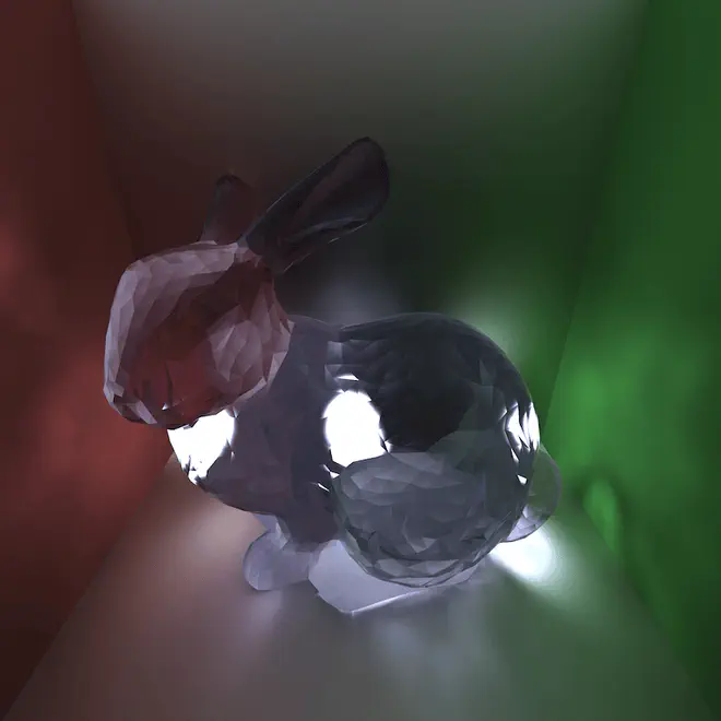 Slightly more complex Stanford Bunny scene with 10 samples per pixel, 800x800 resolution, 8 light bounces per sample.
