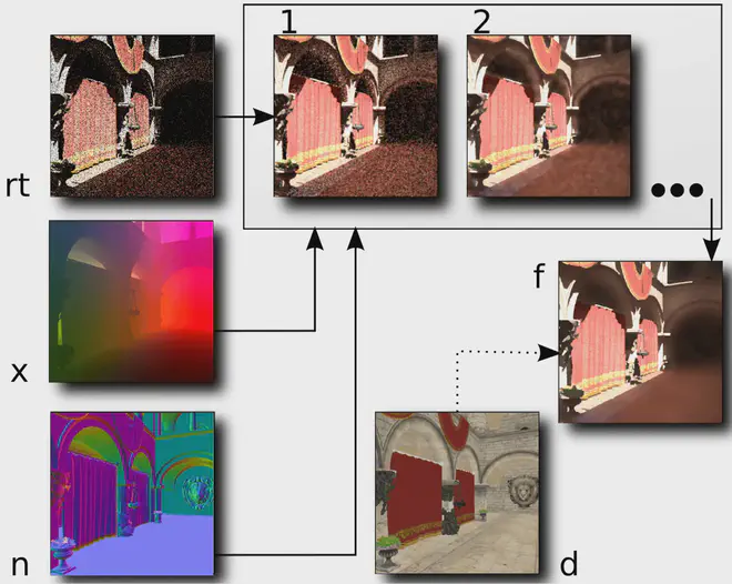A path tracing denoiser that uses geometry buffers (G-buffers) to guide a smoothing filter.