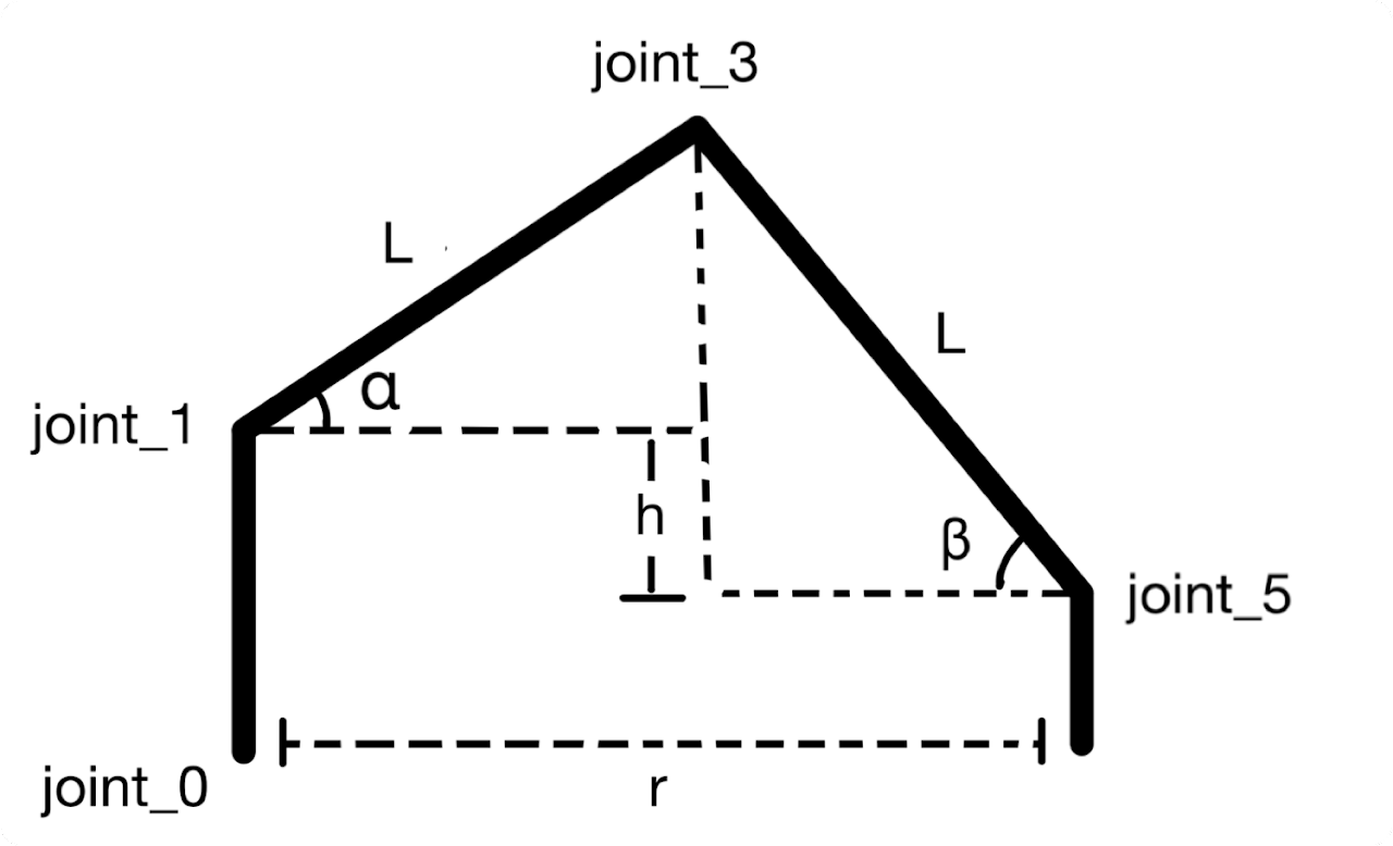 $$ r = L \times \cos(\alpha) + L \times \cos(\beta) $$ $$ h = L \times \sin(\beta) - L \times \sin(\alpha) $$