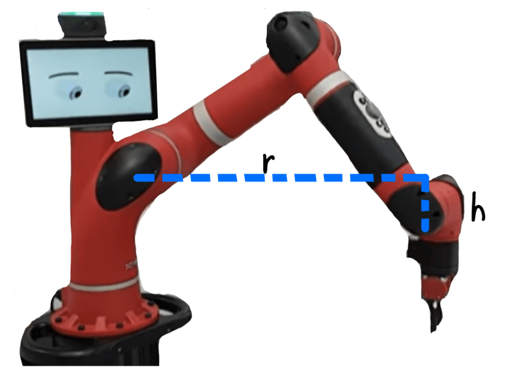 为了计算其他关节的角度以表示高度和长度,我们将Sawyer抽象为这个2-D模型。通过几何关系,
